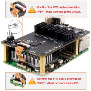 • Don't power the X1009 via DC powe jack and the Raspberry Pi5 via USB-C at the same time. Just power the X1009, and then the X1009 will power the Pi 5 via the GPIO.